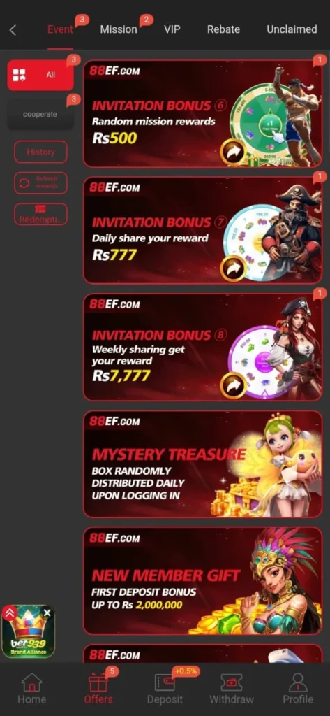88EF Game offers uncountable features which are so beneficial and they also provide entertainment, like this game offers 24 hours’ active customer support services, interesting bonuses, exciting rewards and referral bonus through which you can invite your family and friends to this platform and get a chance to win more.