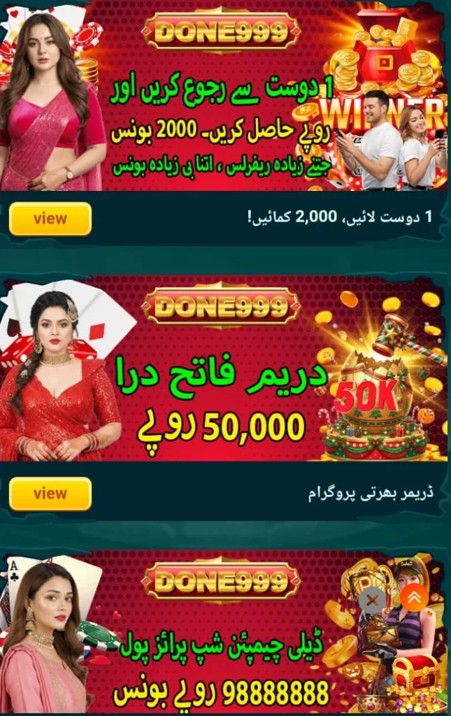 In this article, we will talk about the features of Done999 Game and how to capture the hearts of Pakistani gamers throughout this game, and also talk about the download purpose and registration process. It is a new app in Pakistan that offers various features and fun. This platform allows players to make money. When we talk about the features of this game, it provides countless features, like it provides various kinds of bonuses, Lucky spin daily rewards, and many other types of ways, like referral bonus, through which we can improve our earnings. This game also offers 24-hour active support services through which we can solve any questions we face related to the game.