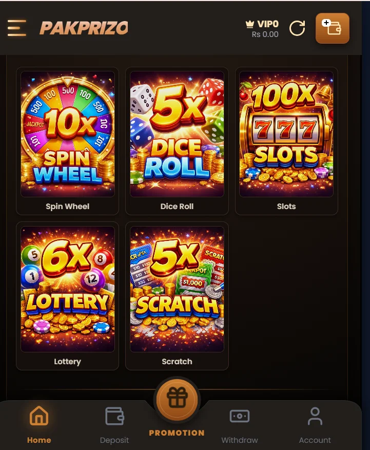 Pak Prizo Game online platform provides a user-friendly interface to help you navigate different sections and promotions easily, through which you can easily play any of the games. Due to the simple interface, you can access and be reliable to play any type of game. Another important and good feature of this game is that it also provides effortless rewards to keep you captivated and motivated for long-term beating, which is why you can easily earn money.